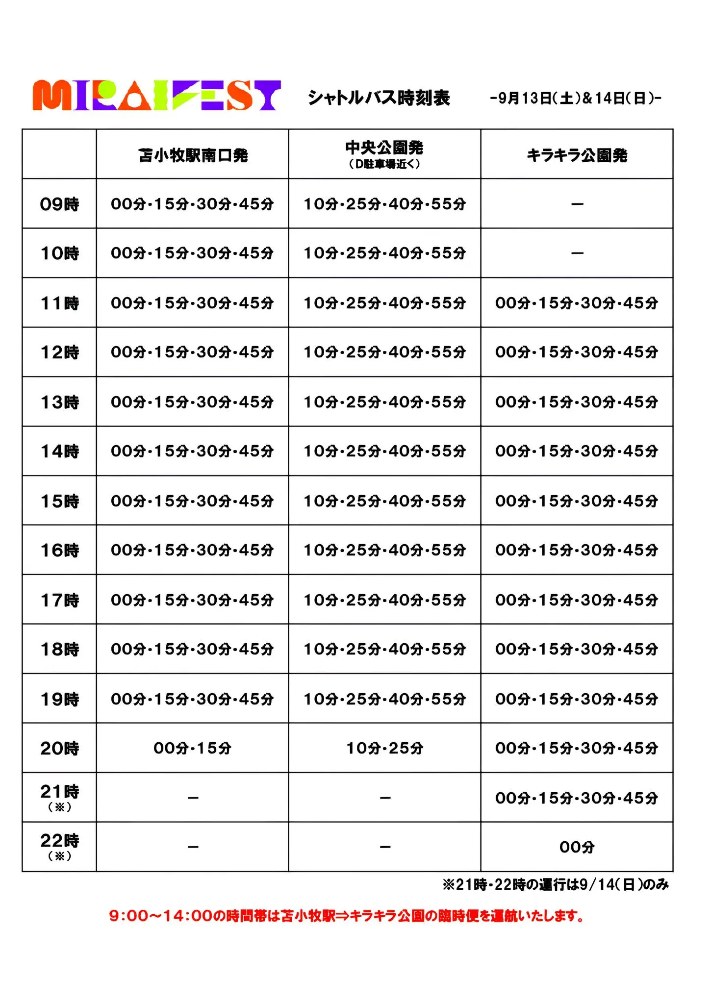 - ・運行経路:JR苫小牧駅南口⇄中央公園(D駐車場近く)⇄キラキラ公園(約20分)